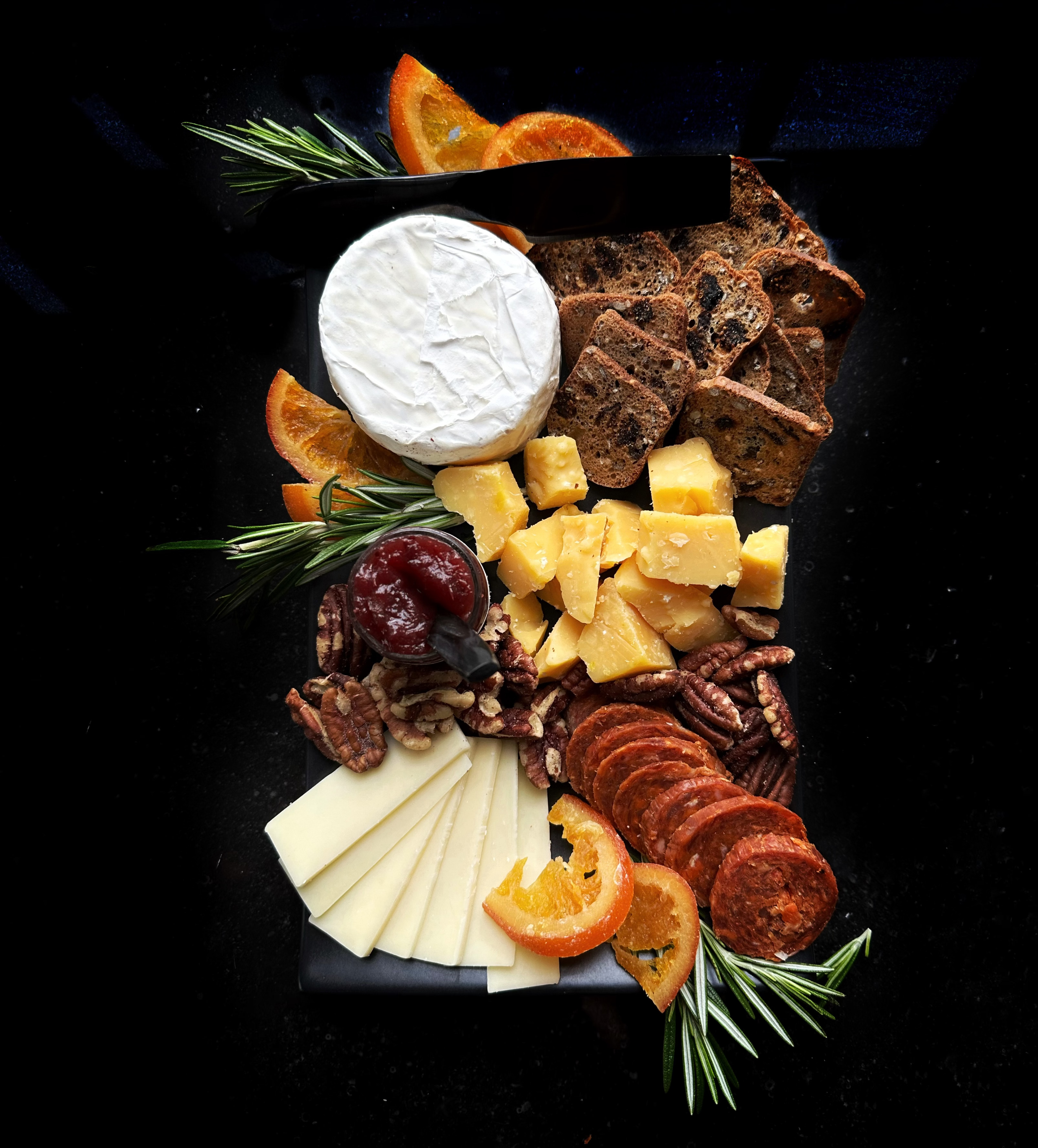 Let’s get this party started with a little build video, featuring Cypress Grove’s Little Giant, Trader Joe’s 1,000 Day Gouda, and Gruyere, with apple cranberry jam, sopressata piccante salami, salted pecans, TJ’s fig & olive crisps, candied oranges, and rosemary. Step-by-step instructions are below!